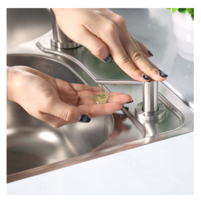Рідке мило заливається зверху, через зйомну насадку без від’єднання ємності. Для промивання ємності дозатора всього лише потрібно заповнити його водою і прокачати носиком.