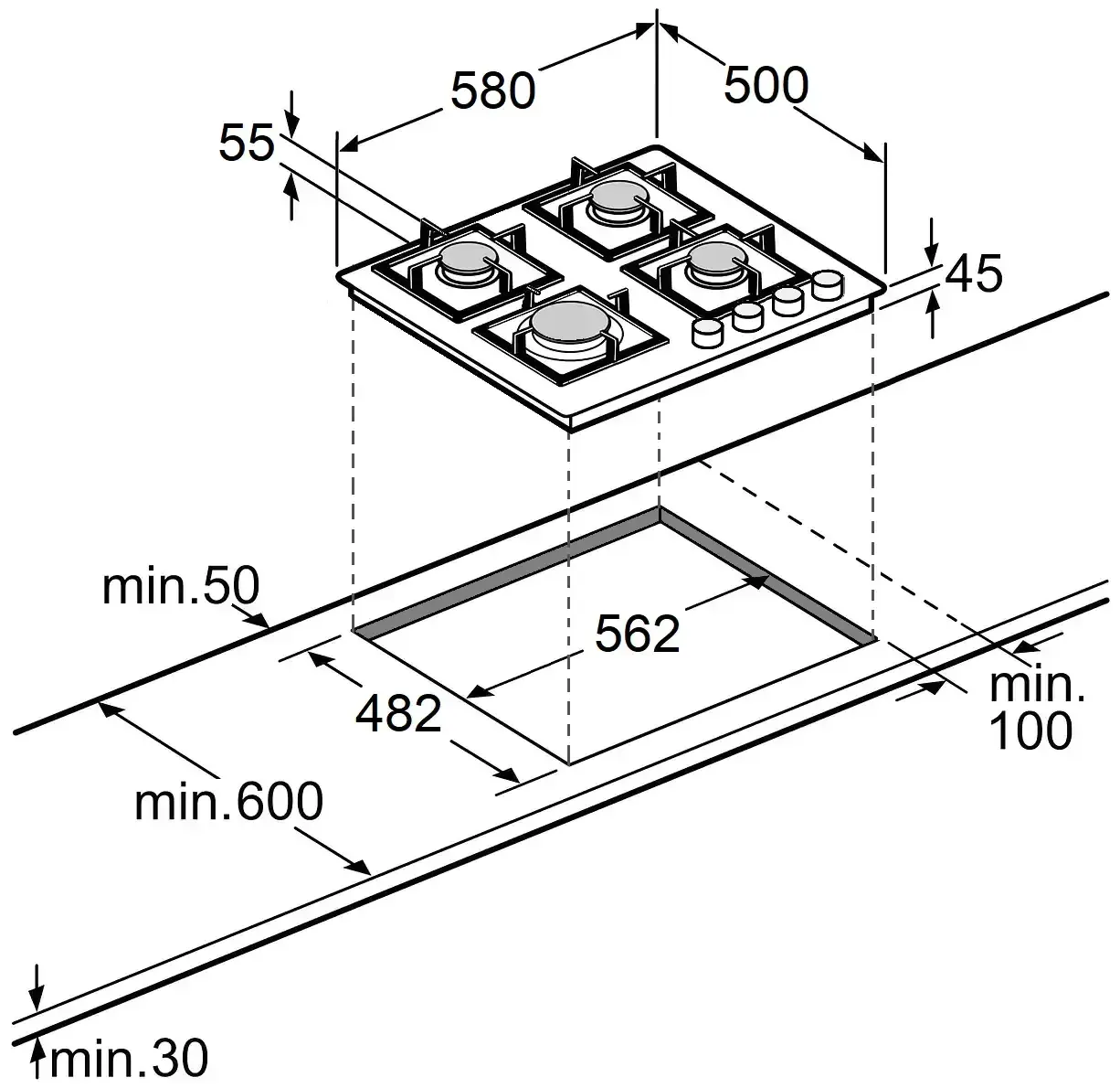 Ширина варильної поверхні 58 см.