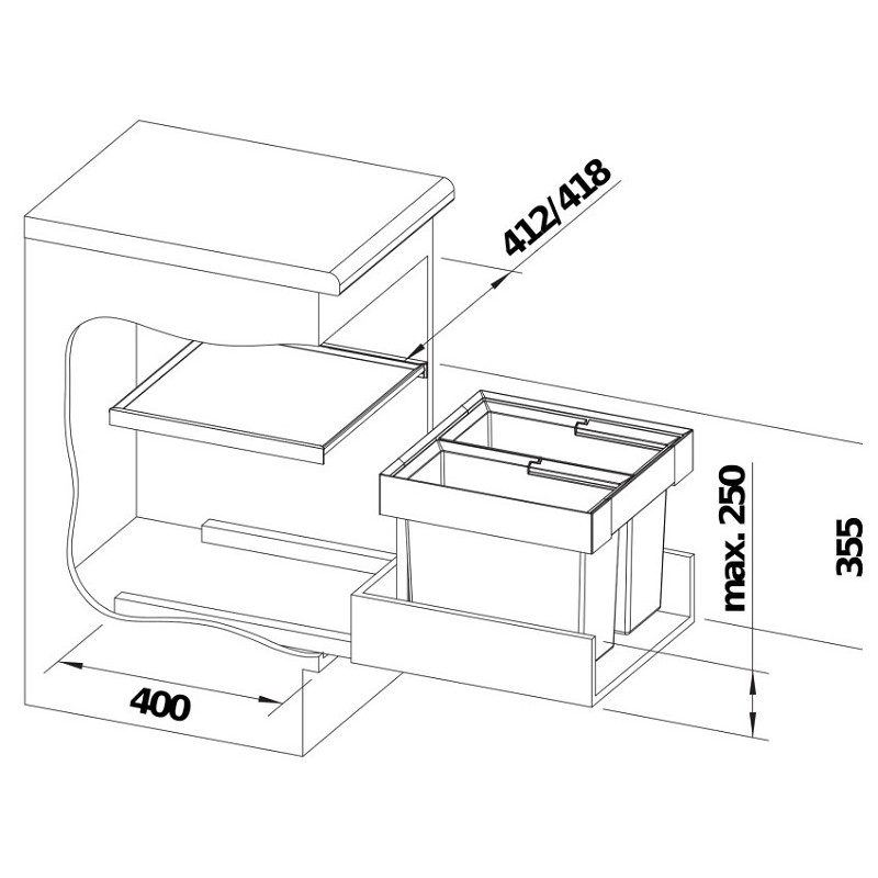 - Загальна висота для встановлення — 355 мм від дна шафи, висота для встановлення без кришки системи — 325 мм від дна шафи, глибина шафи для встановлення — 400 мм (вимірювання всередині шафи)